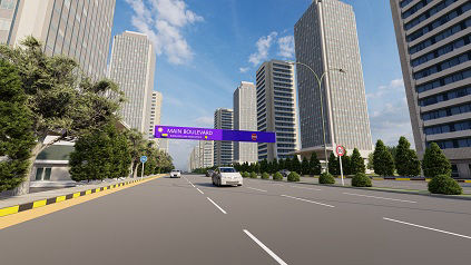 High-Tech Mall, Luminous corridors, Wide SMD video walls on façade, pixilated lightning which animates the façade at night, earthquake resilient structure.